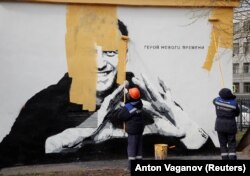 Рабочий закрашивает граффити с изображением Алексея Навального в Санкт-Петербурге, 18 апреля 2021 года